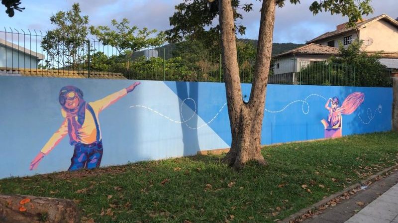 No Neim Doralice Teodora Bastos (Canasvieiras) a brincadeira é essência das pinturas. Há criança no balanço, com borboletas, criança puxando carrinho, crianças olhando pássaros, soltando bolinhas de sabão. “Ficou a nossa cara, o mais importe na educação infantil é o brincar”, diz orgulhosa a diretora Claudia de Almeida. Há duas frases nos muros: ‘bem-vindo ao seu território, agora nosso lugar” e “brincar é um desejo de viver por completo”.