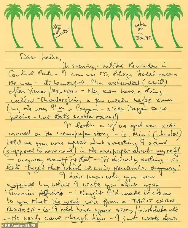 A carta também revela o receio de Lennon em visitar a Inglaterra para se despedir de sua tia Mimi Smith, temendo que fosse a última vez que a veria. “Sou um covarde em despedidas”, confessou o músico. Além das referências familiares, Lennon menciona uma viagem que faria com Yoko Ono ao Cairo e a Genebra. Além disso, aproveita para ironizar, dizendo: “Gostaria que pudéssemos desenterrar alguns parentes do seu pai.” Conforme escreve.
