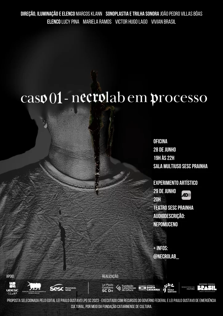 No sábado (29), às 20h, acontecerá a apresentação do experimento cênico “Caso 01 – Necrolab em processo”, resultado de dois anos de experimentações com estudantes do curso de Licenciatura em Teatro da UDESC. A entrada é livre.