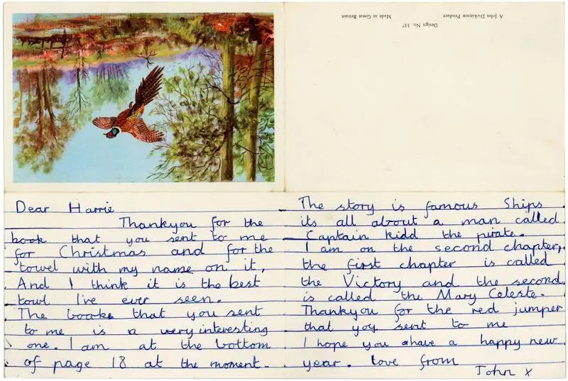 Na carta, Lennon demonstra entusiasmo pelo livro que ganhou, escrevendo: “O livro que você enviou para mim é muito interessante. Estou na parte inferior da página 18 no momento. A história é sobre navios famosos e é tudo sobre um homem chamado Capitão Kidd, o pirata. Estou no segundo capítulo, o primeiro capítulo é chamado de Victory e o segundo é chamado de Mary Celeste.” Conforme escreveu.